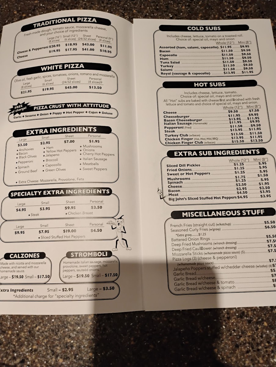 But the excitement doesn’t stop there! With hot subs that range from Cheeseburgers to Chicken Finger Clubs, each dish is crafted with quality and taste in mind. For just a touch more, you can customize your sub with toppings like fried onions and Big John's sliced stuffed hot peppers.